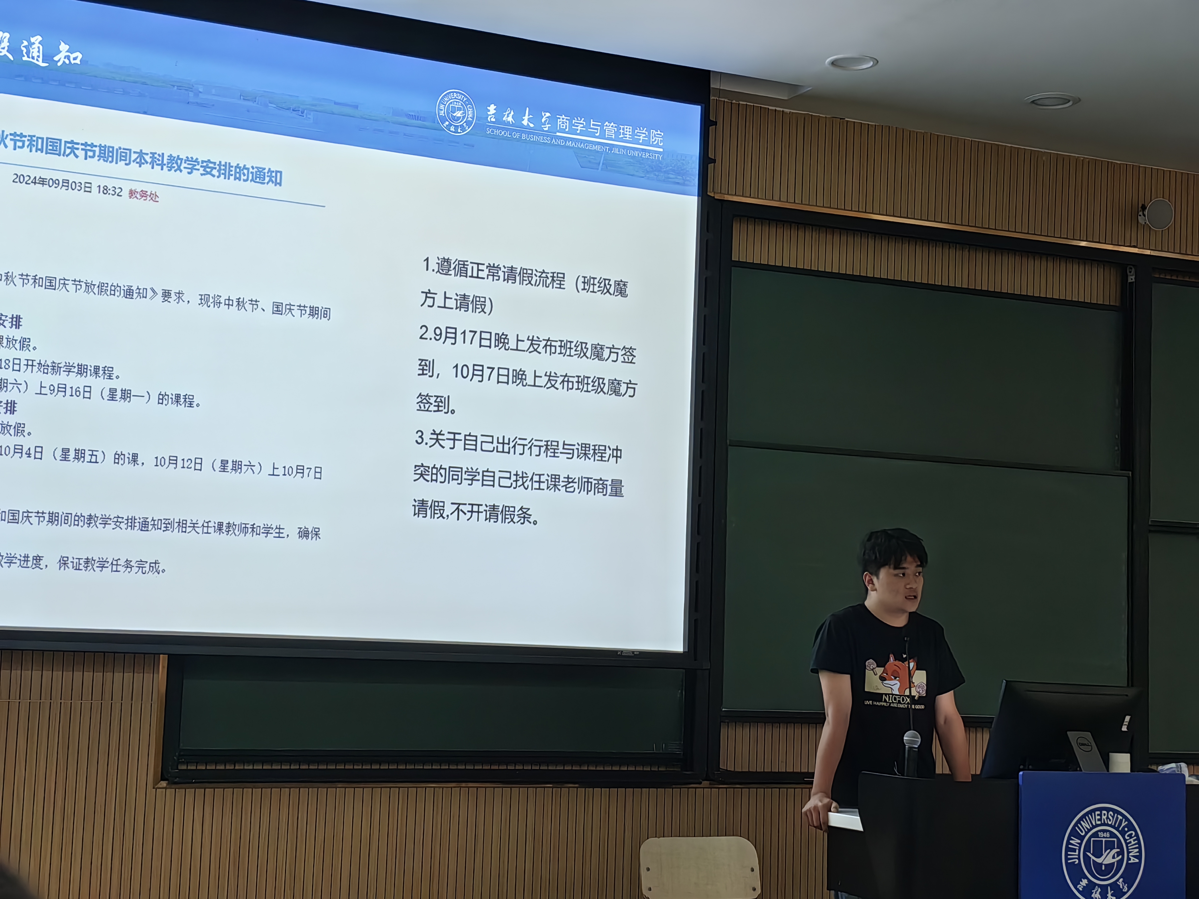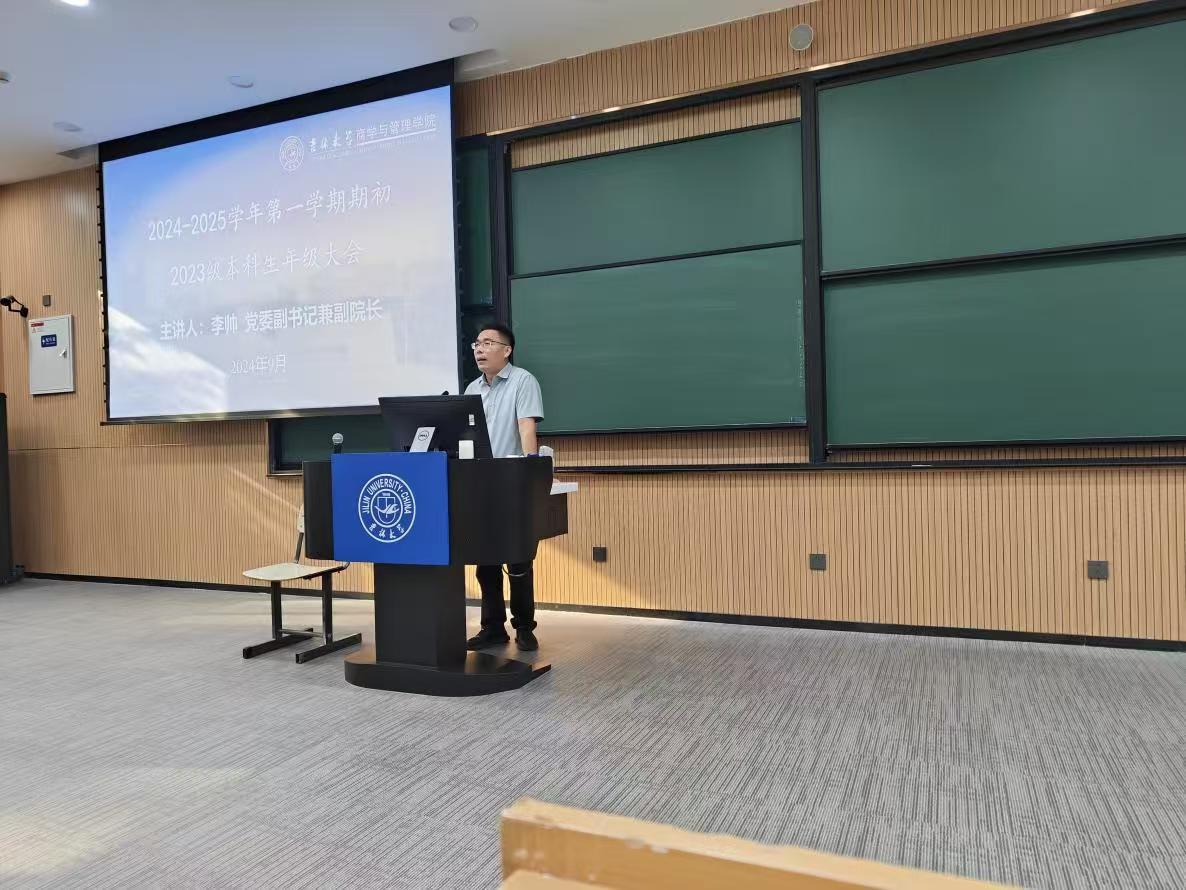 李帅书记说,学业是每位学生的首要任务,同学们应当端正学习态度,全力以赴;不仅要注重学习质量,还要追求学习效率,把每一次学习都当作是对自己知识和能力的投资。他鼓励同学们遇到困难时,要有毅力与决心去克服它们,以提高自我解决问题的能力。李帅书记的殷殷嘱托与亲切关怀,让同学们对大学生活与学习有了更深刻的认识与更清晰的规划。随后,罗小杰老师对学生日常管理和中秋国庆期间放假通知进行了说明,强调了寝室安全、请假流程以及冰球突破