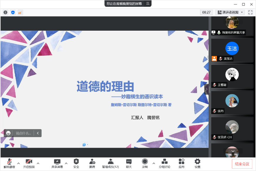 会议伊始,隗誉铭首先为我们介绍了由詹姆斯·雷切尔斯和斯图尔特·雷切尔斯所著的《妙趣横生的通识读本:道德的理由》一书。此书围绕以追问何为道德,讲述了道德判断必须基于充足的理由,还要公平地考虑每一个个体的利益。它提示我们应要思考伦理学或者道德哲学所要探讨的问题,来指导我们的日常生活。同时,隗誉铭在汇报中还重点介绍了包括文化相对主义、伦理主观主义、伦理利己主义、社会契约理论、功利主义等在内的道德相关理论,并对如何看待事物以及应保有什么样的价值观表达了自己的感想。随后,王馨凝和樊镁汐同学分别从自身经历和罗翔的《法律的细节》引申了对道德与法制的进一步思考。