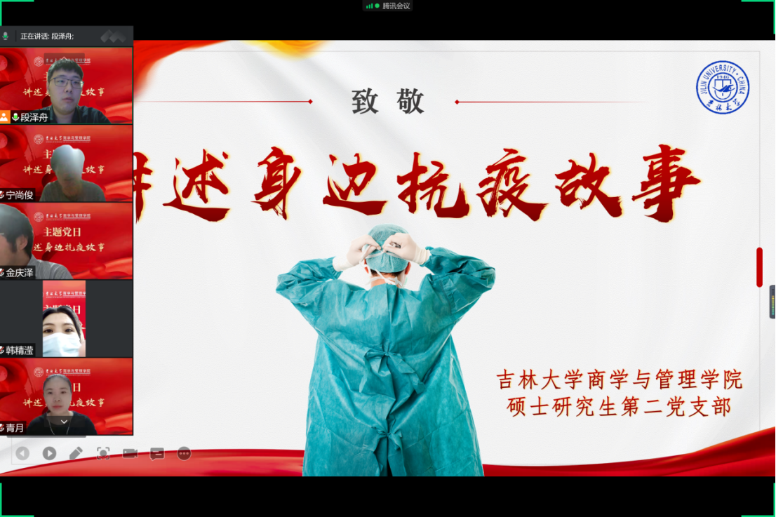 为丰富同学们的学习和课余生活,组织开展了内容丰富、角度多元的讲座,MBA系列讲座增加了同学们理论知识的深度,其他讲座更是能够拓宽视野,增加思维宽度。疫情期间,如果大家能够坚持学习,努力提升自己的思维和精神,将是一个很好的弯道超车机会。随后,段泽舟邀请在疫情期间担任志愿者工作的同学分享了自己和身边的抗疫故事。路畅表示,通过志愿者服务工作,自己深切地感受到平静的生活和充足的供给背后,是有那么多人的辛苦付出,与保洁阿姨互道的辛苦,是对心最温暖的补给。王长春表示,疫情改变了原有的生活节奏,但却没能改变我们对生活的热爱,作为党员,在这个特殊时期能够服务大家,他所感受到的是满满的幸福。