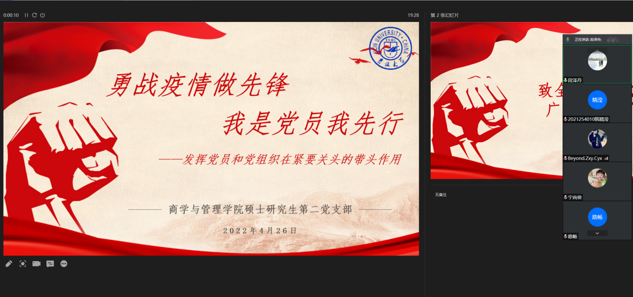 4月26日,硕士研究生第二党支部召开了以“勇战疫情做先锋,我是党员我先行”的主题党日活动,结合疫情期间党组织和党员的作用,学习和讨论党员和党组织在紧要关头能够发挥的带头作用。本次活动由段泽舟主持。