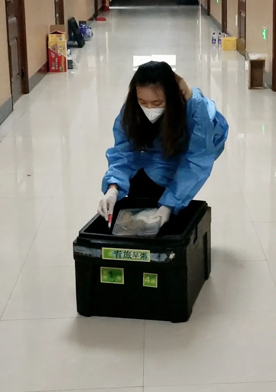 安排,与楼内其他志愿者一道,负责发放餐食和防疫物资。尽己所能为大家服务,穿着防护服从一楼取餐,并配送到寝室门口,帮助同学们反馈信息和解决问题。