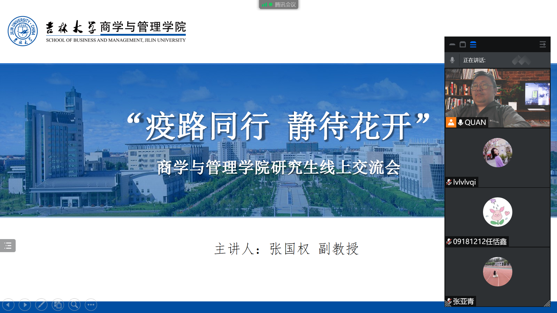 研究生导师张国权老师于线上以腾讯会议的形式组织开展了每周例行组会,组内同学吕琦、张亚青和任恬馨共同参加。
