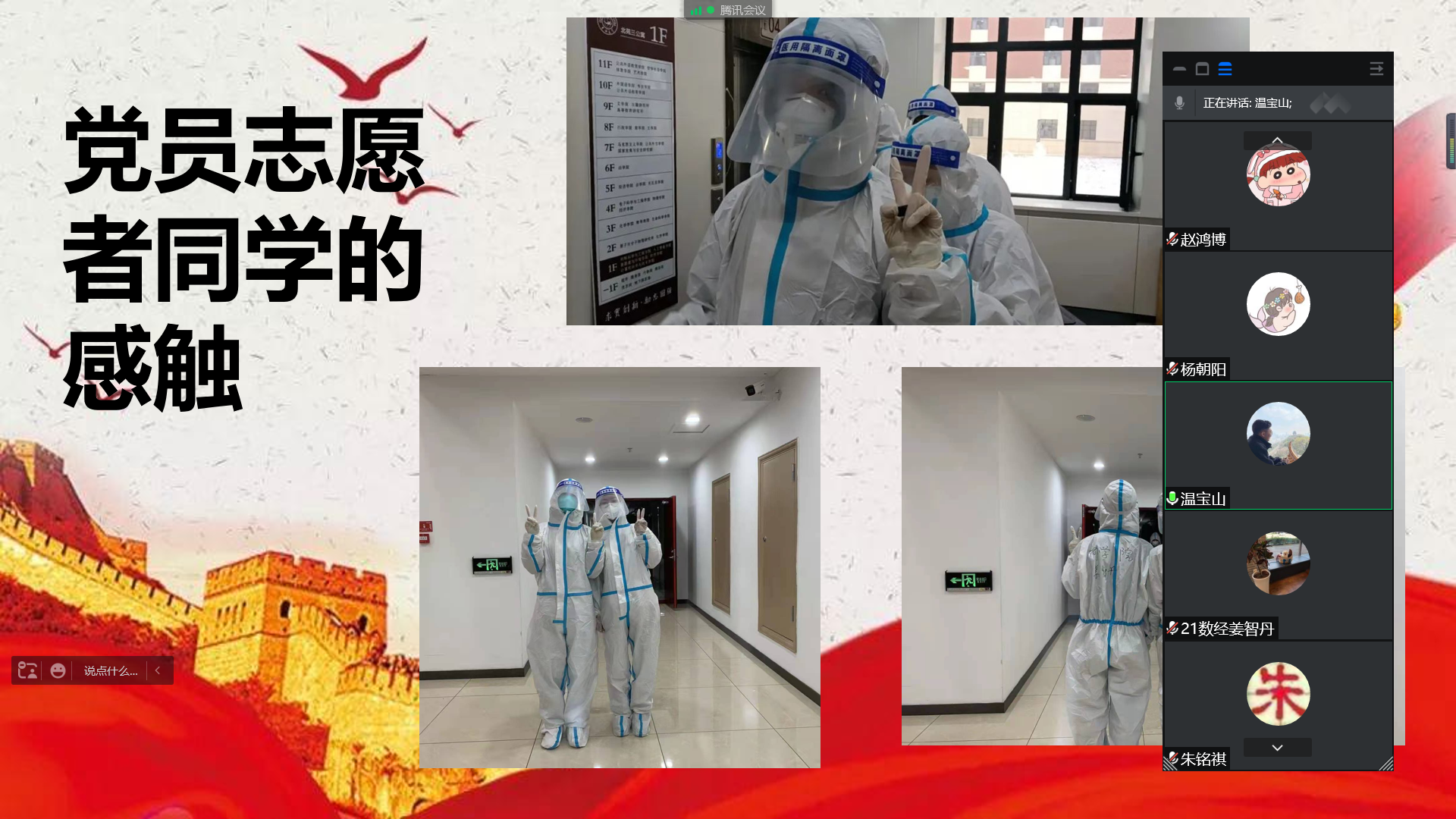 温宝山表示,首先从防控的层级就可以看出此次疫情的严峻程度,连送饭都全副武装成了大白,党员同学们也都积极的为同学们服务,楼道里都能看见我们党员同学的身影,期待在冰球突破