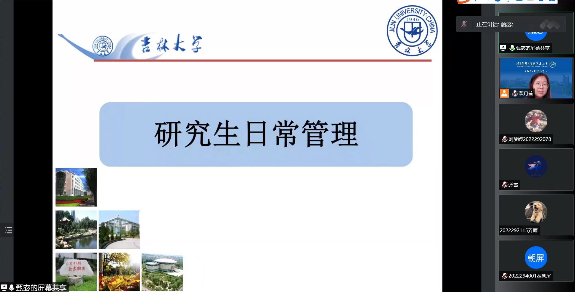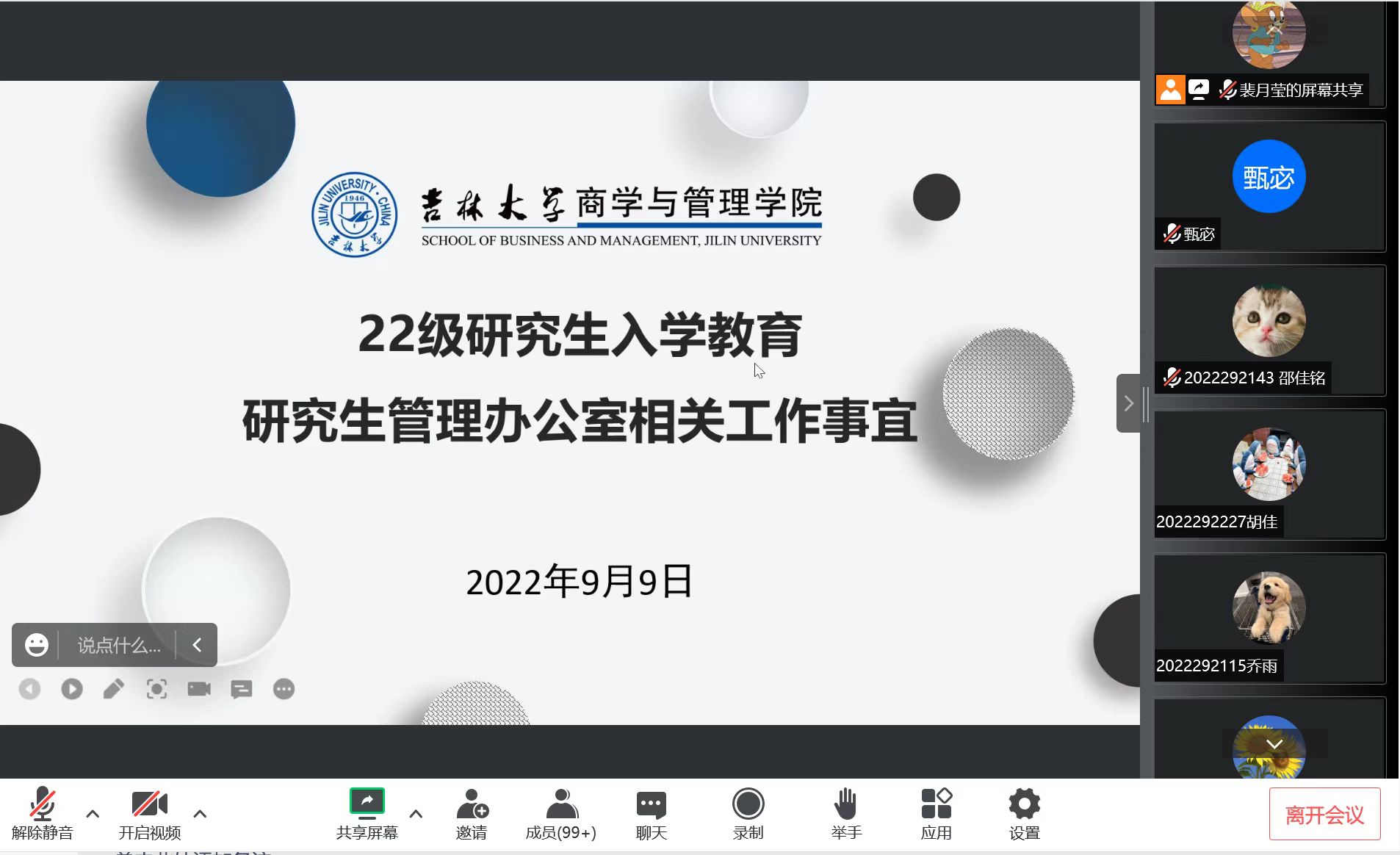 研究生办公室主任甄宓老师和研究生辅导员裴月莹老师主持本次会议,全体2022级研究生新生参会。