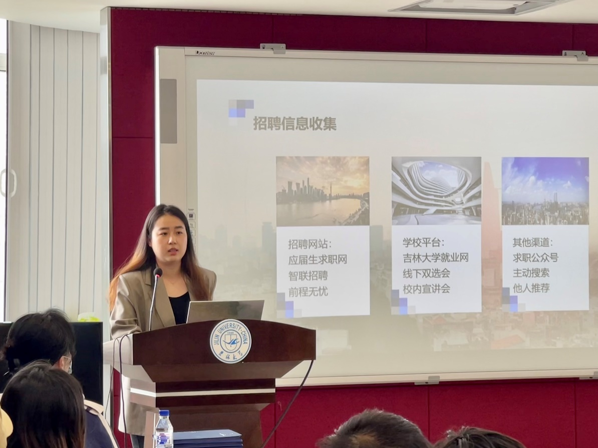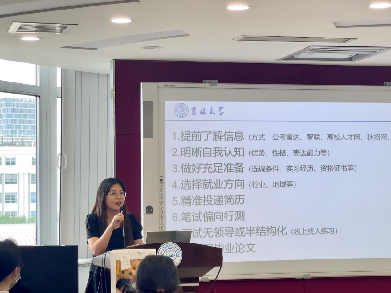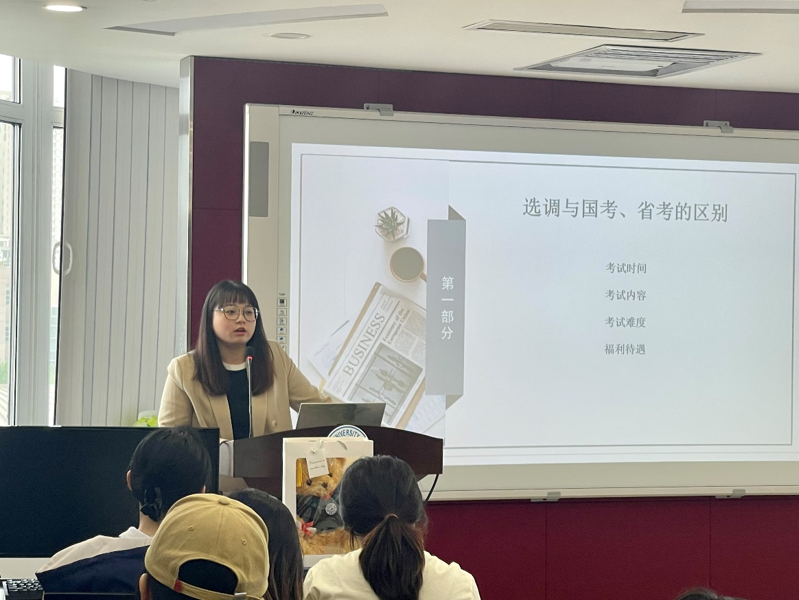 2021级硕士研究生罗慧,为同学们梳理了求职的过程,包含通过何种方式提前了解信息;从优势、性格、表达能力等方面明晰自我认知、求职前提前做好目标岗位的准备,例如:选调条件、实习经历、资格证书等为求职打下牢固的基础;根据行业、地域等条件选择自己的就业方向;精准投递简历,节省时间;笔试偏向行测;面试无领导或半结构化面试;建议同学们提前准备毕业论文等内容。